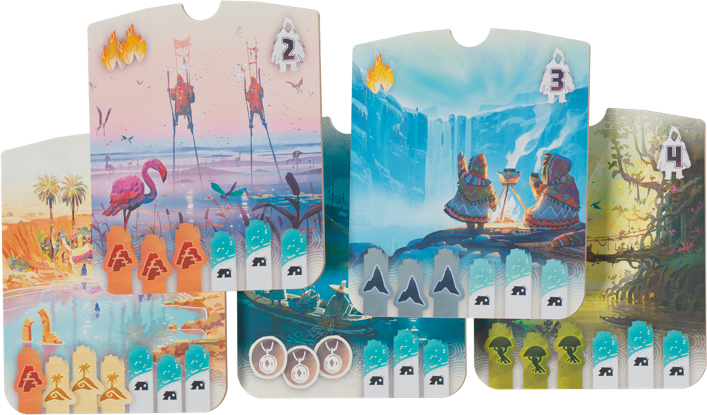 Chaque tour, vous devrez choisir entre piocher de précieuses cartes Terrain ou avancer sur la carte. Le moindre mouvement compte : vos camps bloquent, connectent ou ouvrent de nouvelles voies vers la victoire. Grâce à un système de placement malin, des objectifs à valider (tuiles Histoire) pour marquer plus de points et des effets de terrain variés, chaque décision tactique impacte votre score final. En plus de la conquête de territoires, vous devrez maîtriser le feu, récolter des baies et connecter vos camps pour maximiser votre score. Tout en mettant des batons dans les roues de vos adversaires !
