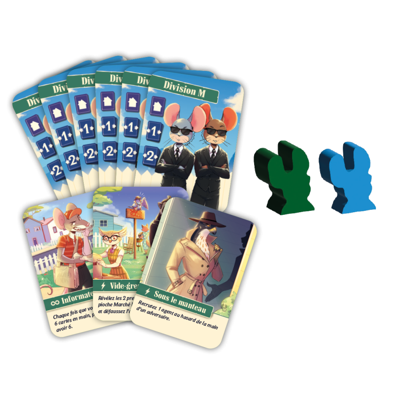 Agent Avenue – Division M est une extension passionnante, qui introduit un tout nouveau type d'agent : les souris de la Division M. Ces agents rusés créent une zone dangereuse autour de votre espace de jeu, ajoutant ainsi une nouvelle dimension stratégique, du suspense et du piquant à chaque partie d'Agent Avenue.