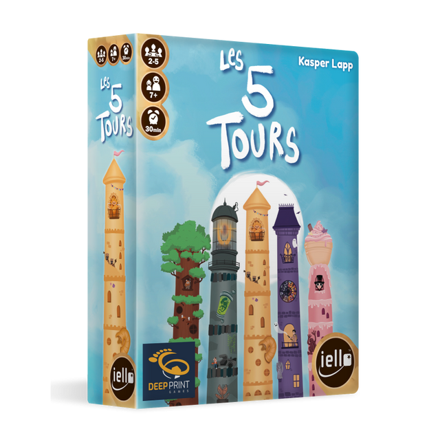 Dans "Les 5 Tours", chaque joueur incarne un architecte qui doit construire des tours à partir de cartes. À chaque manche, cinq cartes sont révélées sur le marché et les joueurs doivent faire des annonces pour déterminer combien de cartes ils souhaitent prendre. Mais attention, vous ne pouvez construire qu'une tour de chaque type et les cartes doivent être empilées dans l'ordre décroissant.