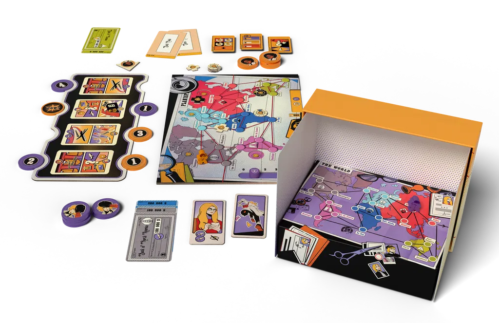 Au fil des manches, Angela Farbank et Jessah Hope s'affrontent pour atteindre leur objectif en premier. En jouant Angela, parcourez le monde et encaissez de faux chèques pour un total de 1 000 000 $. Votre planisphère personnel vous permet de consigner secrètement vos déplacements. Si vous êtes capturée, utilisez vos fausses identités pour vous échapper. En incarnant Jessah, grillez les couvertures d'Angela en la localisant, puis arrêtez-la avant qu'elle ne réalise son plan. Heureusement, les ressources quasi illimitées du FBI sont à votre disposition : à mesure que les chèques seront encaissés, votre hiérarchie vous donnera les moyens d'agir. Quel que soit votre rôle, 4 cartes Action piochées aléatoirement déterminent, lors de chaque manche, les choix s'offrant à vous deux. Placez tour à tour vos jetons pour planifier quand et comment agir, puis résolvez les actions selon leur valeur.